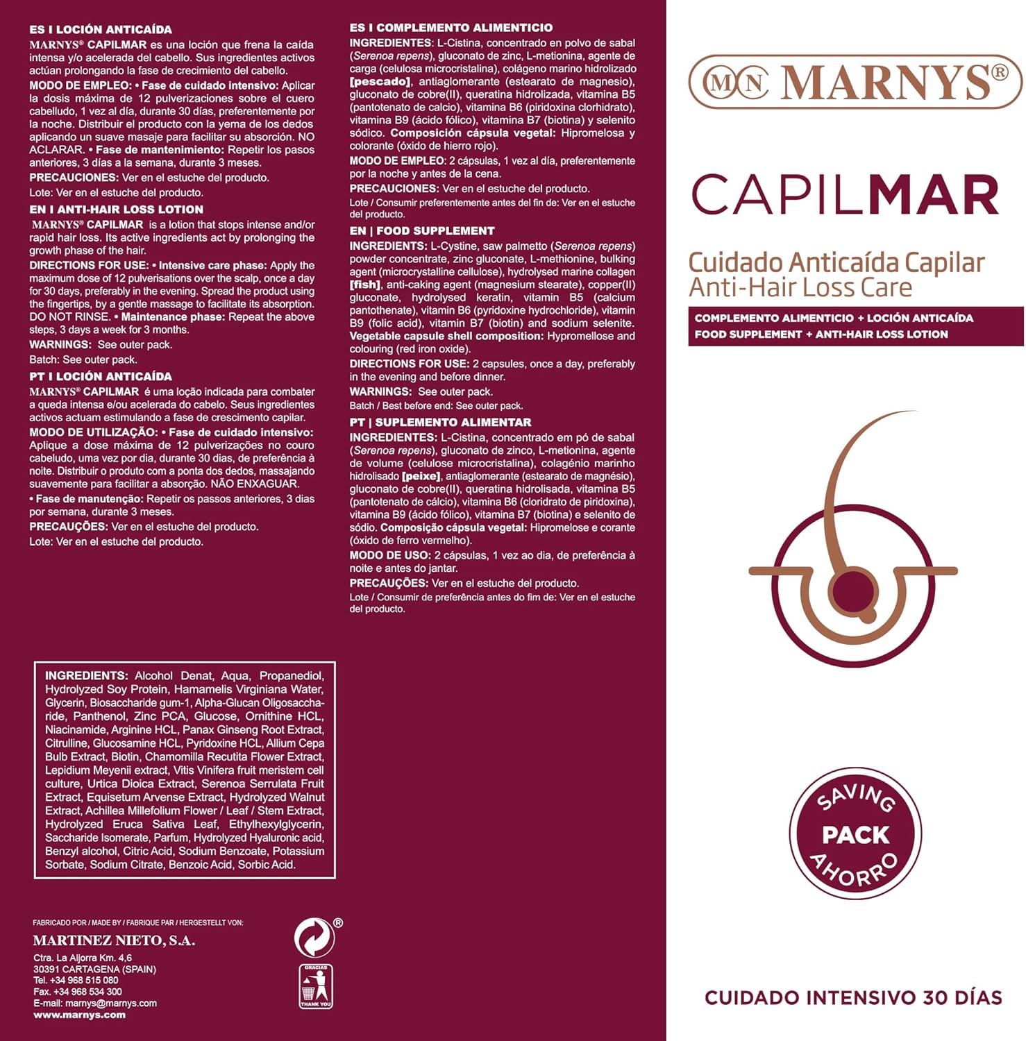 Cápsulas CAPILMAR: L-cistina, concentrado de Sabal en polvo (Serenoa repens), gluconato de zinc, L-metionina, agente de carga (celulosa microcristalina), colágeno marino hidrolizado [FISH], antiaglomerante (estearato de magnesio), gluconato de cobre(II), queratina hidrolizada, vitamina B5 (pantotenato cálcico), vitamina B6 (clorhidrato de piridoxina), vitamina B9 (ácido fólico), vitamina B7 (biotina) y selenito de sodio. Composición de la cápsula vegetal: Hipromelosa y colorante (óxido de hierro rojo). Loción anticaída CAPILMAR: Alcohol desnaturalizado, agua, propanodiol, proteína de soja hidrolizada, agua de hamamelis Virginiana, glicerina, goma de biosacárido-1, oligosacárido de alfa-glucano, pantenol, PCA de zinc, glucosa, clorhidrato de ornitina, niacinamida, clorhidrato de arginina, extracto de raíz de Panax ginseng, Citrus ulline, clorhidrato de glucosamina, clorhidrato de piridoxina, extracto de bulbo de Allium cepa, biotina, extracto de flor de Chamomilla recutita, extracto de Lepidium meyenii, cultivo de células de fruto de meristemo de Vitis vinifera, extracto de Urtica dioica, extracto de fruto de Serenoa serrulata, extracto de Equisetum arvense, extracto de nuez hidrolizado, extracto de flor/hoja/tallo de Achillea Million Lefolium, hoja hidrolizada de Eruca sativa, etilhexilglicerina, isomerato de sacárido, perfume, ácido hialurónico hidrolizado, alcohol bencílico. Ácido cítrico, benzoato de sodio, sorbato de potasio, citrato de sodio